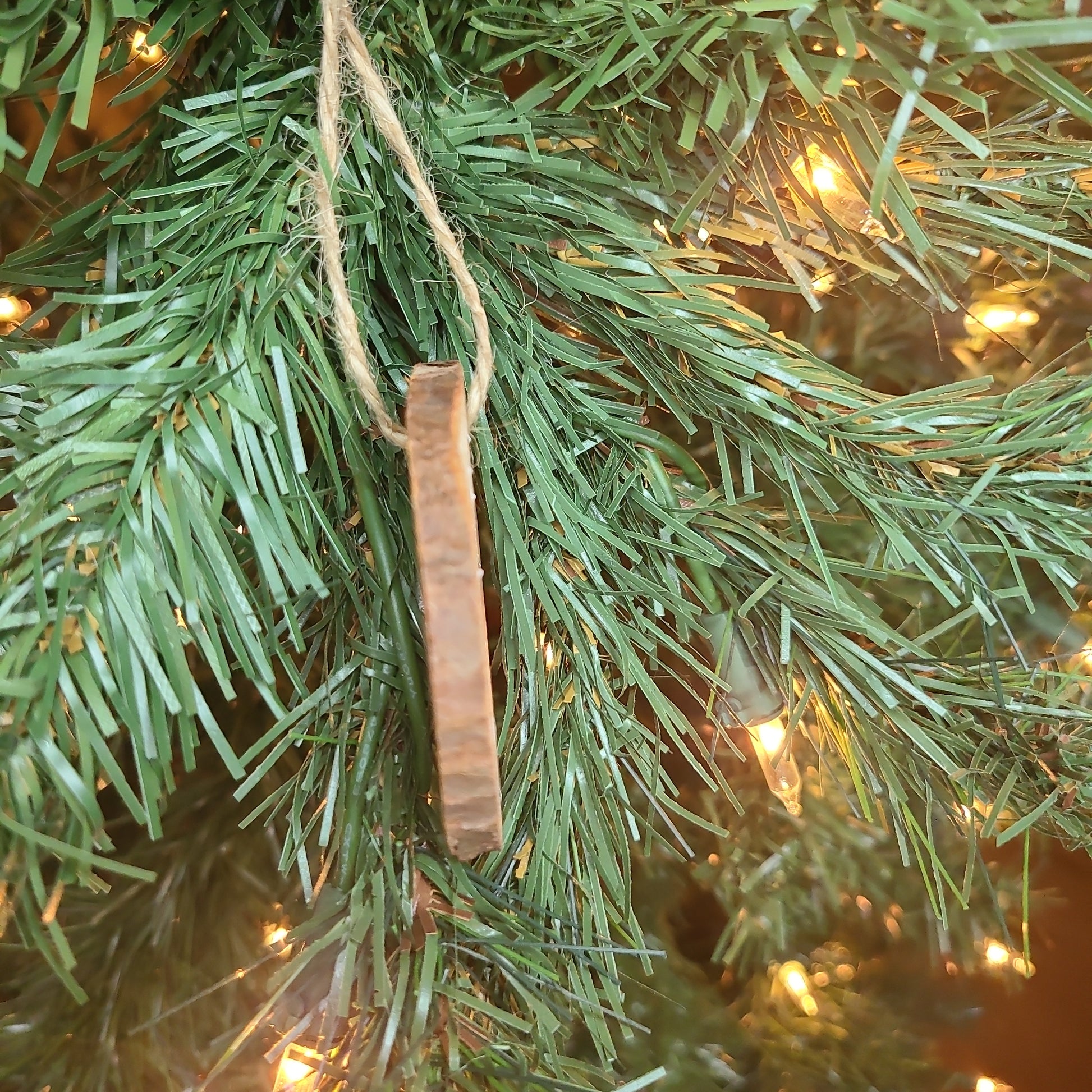 Acrylic paints on a slice of natural pine wood with bark edge. This will arrive pre-strung with twine. Each "charlie brown tree" is hand crafted and unique. No two are alike. There could be variations in the wood such as knots, grains, splits and cracks. Temperatured, light and humidity variations can cause changes to this natural wood ornament. Some bark may fall off over time due to the naturalness of the ornaments. These changes are what make each ornament unique and rustic.