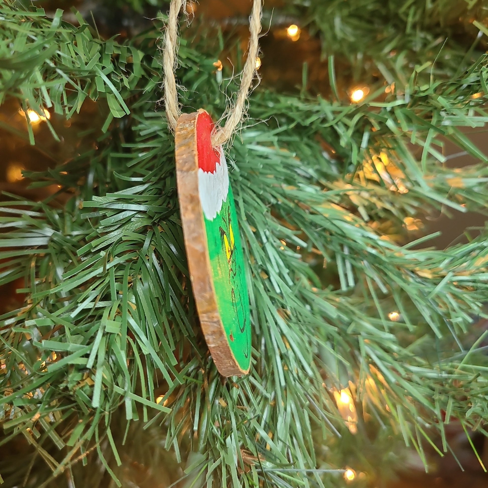 Acrylic paints on a slice of natural pine wood with bark edge. This will arrive pre-strung with twine. Each "Grinch" is hand crafted and unique. No two are alike. There could be variations in the wood such as knots, grains, splits and cracks. Temperatured, light and humidity variations can cause changes to this natural wood ornament. Some bark may fall off over time due to the naturalness of the ornaments. These changes are what make each ornament unique and rustic.